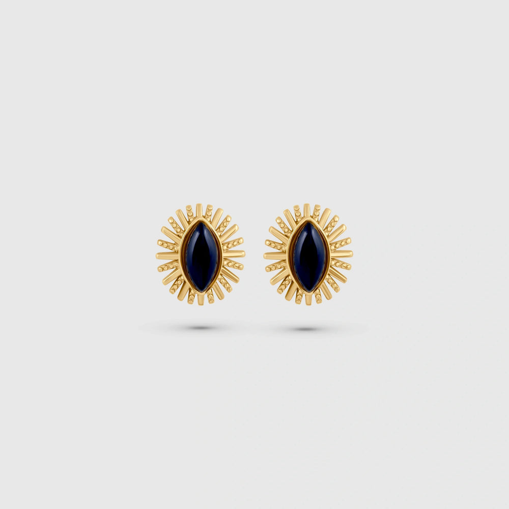 Radiating confidence, the Black Sunburst Earrings feature a bold marquise-cut black center stone framed by sculpted sunburst rays. With their captivating shape and rich contrast, these earrings bring a striking finish to day or night looks.
