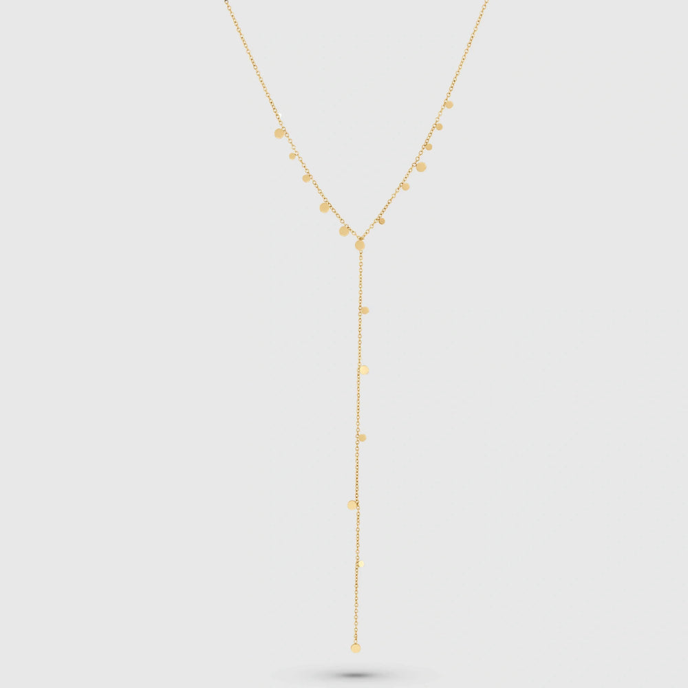 A sleek and minimal Y-shaped necklace adorned with delicate golden dots that flow down the neckline, adding subtle elegance and elongation to the silhouette. A versatile piece perfect for both layering or wearing solo.
