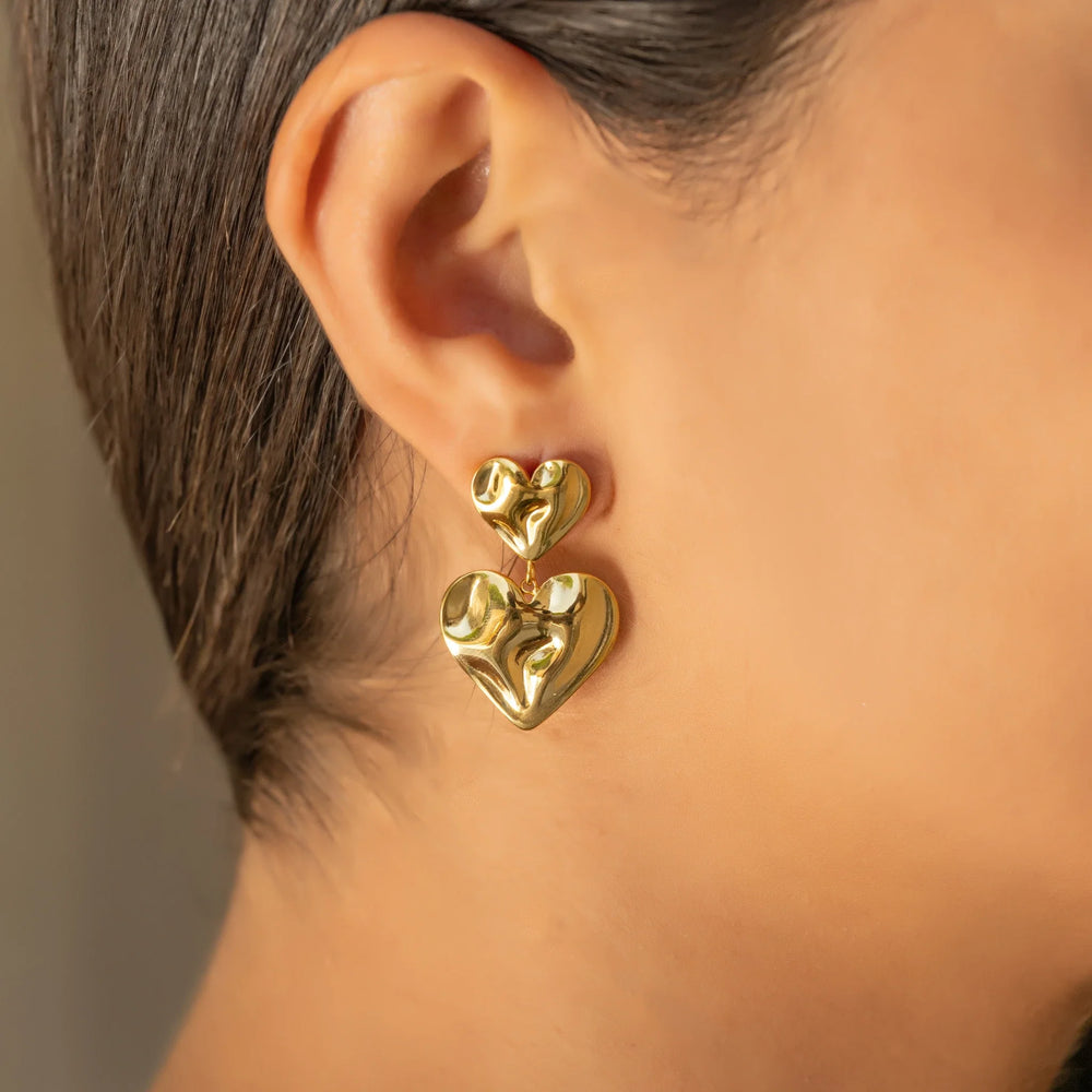 Bold and sculptural, the Double Heart Earrings feature two puffed hearts in a flowing, abstract texture. With a playful drop and polished finish, they add a modern romantic touch to any look.