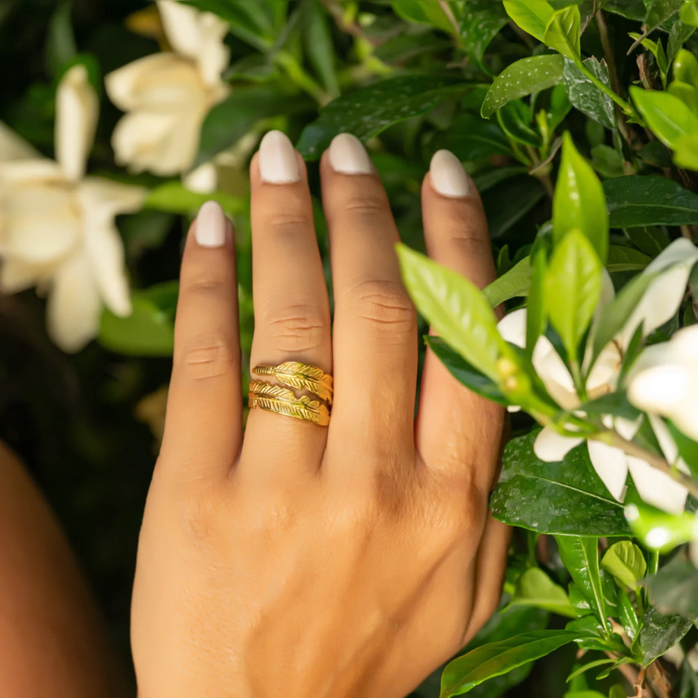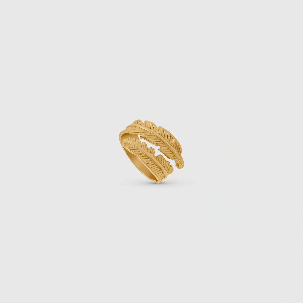 Inspired by the elegance of flight, the Feather Ring features layered feather motifs carved into a bold gold band. Its textured details and symbolic form evoke freedom, grace, and confidence in motion.