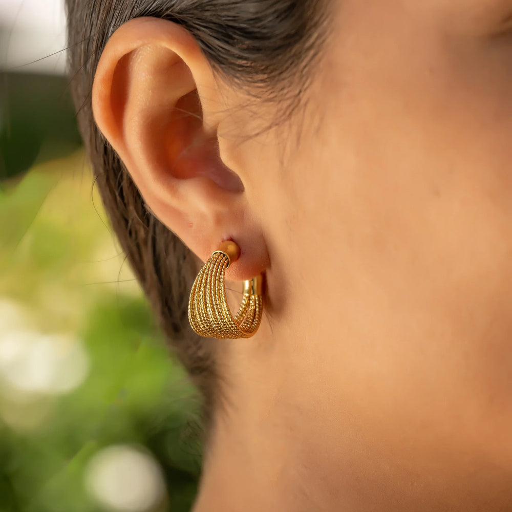 Elegant and radiant, the Golden Cascade Earrings feature layered textured strands flowing gracefully. A luxurious piece that adds shimmering movement to any outfit.