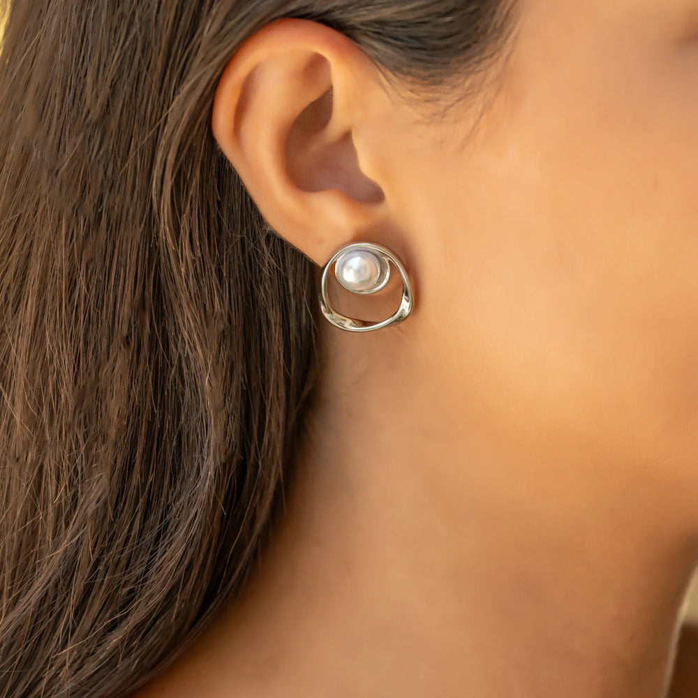 Sculptural and sleek, the Orbit Earrings in silver feature flowing open circles wrapped around a luminous pearl. A statement of minimal elegance - perfect for everyday wear or elevating a night-out look.