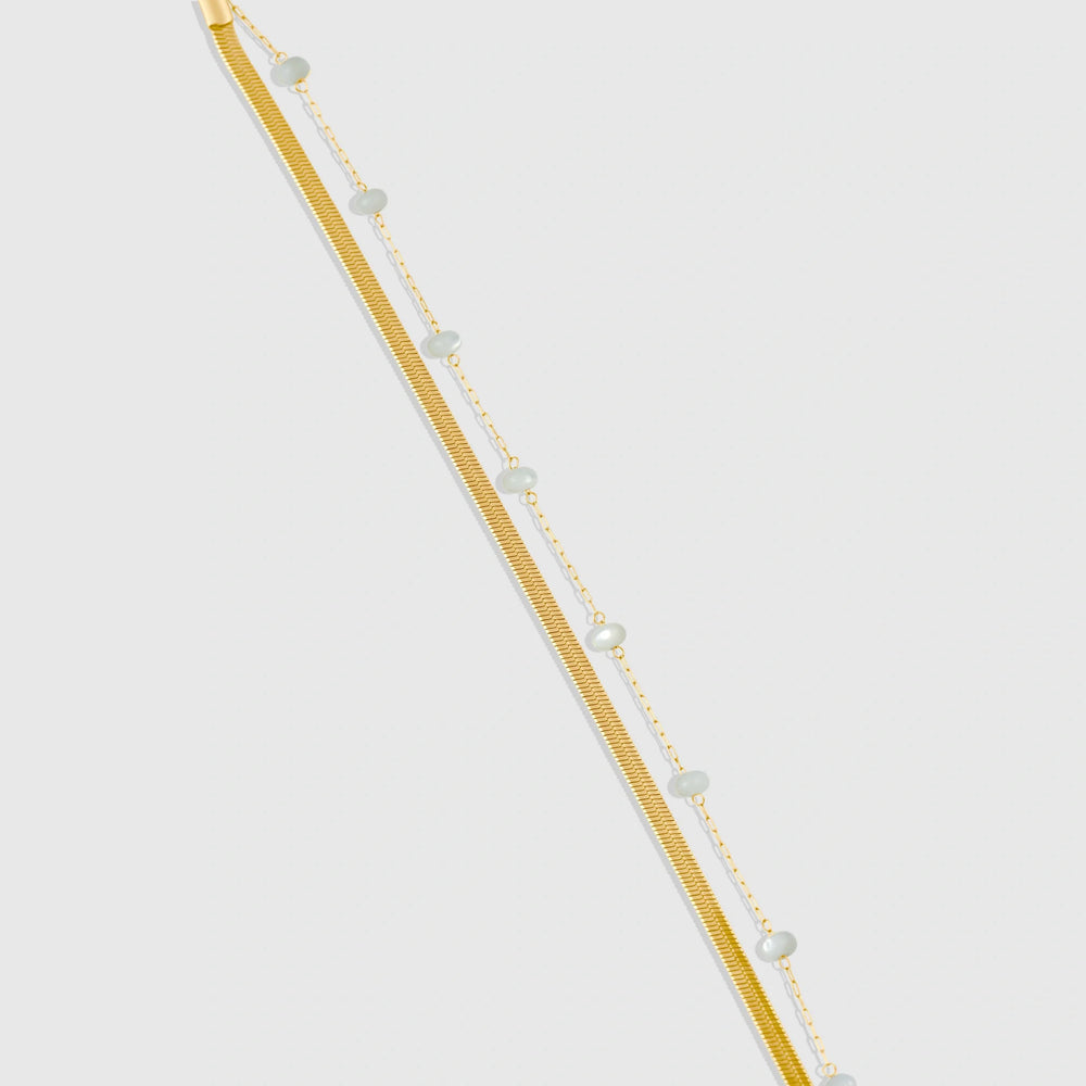Elegant and effortless, the Pearl Drop Anklet features a double-layered gold-tone chain with soft white bead details. A subtle statement that adds charm to any sandal or barefoot moment - beachy, feminine, and fresh. Stainless Steel with 18K Gold Plating
