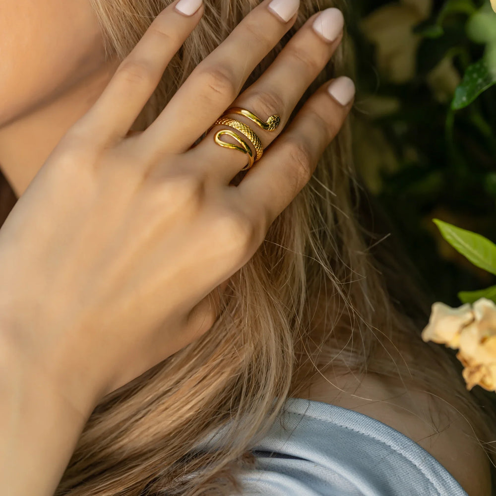 Sleek and symbolic, the Serpira Ring wraps around the finger like a golden serpent. With detailed scale textures and a fluid silhouette, this piece channels power, mystery, and bold self-expression.