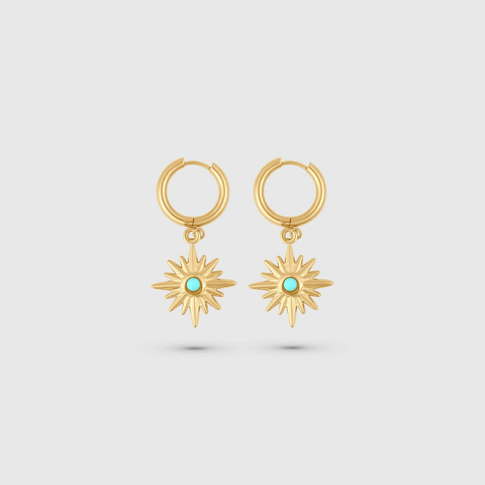 Glowing with celestial energy, the Skyray Earrings feature a radiant starburst charm anchored by a turquoise center. Suspended from sleek gold hoops, they bring a vibrant and playful sparkle to everyday looks.