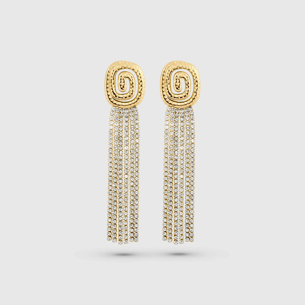 Make a dazzling entrance with the Spiral Earrings. Featuring a textured golden swirl top and cascading crystal strands, this statement pair brings movement, light, and unapologetic glam to every outfit.