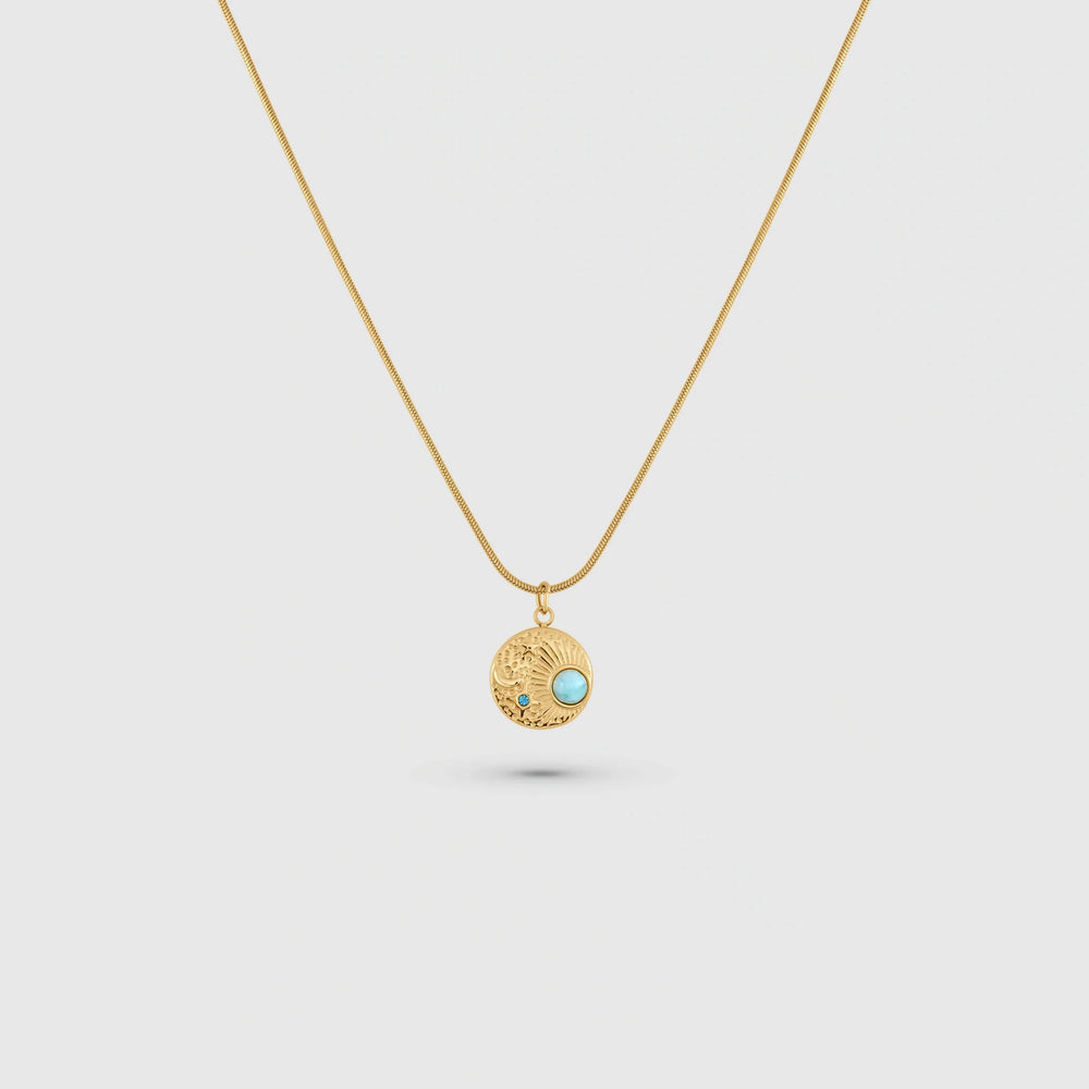 Inspired by the sun, the Sunburst necklace brings warmth and glow to your look. With an intricately carved round medallion and soft gemstone detail, this piece shines with meaning and elegance - ideal for layering or wearing solo as a subtle statement.