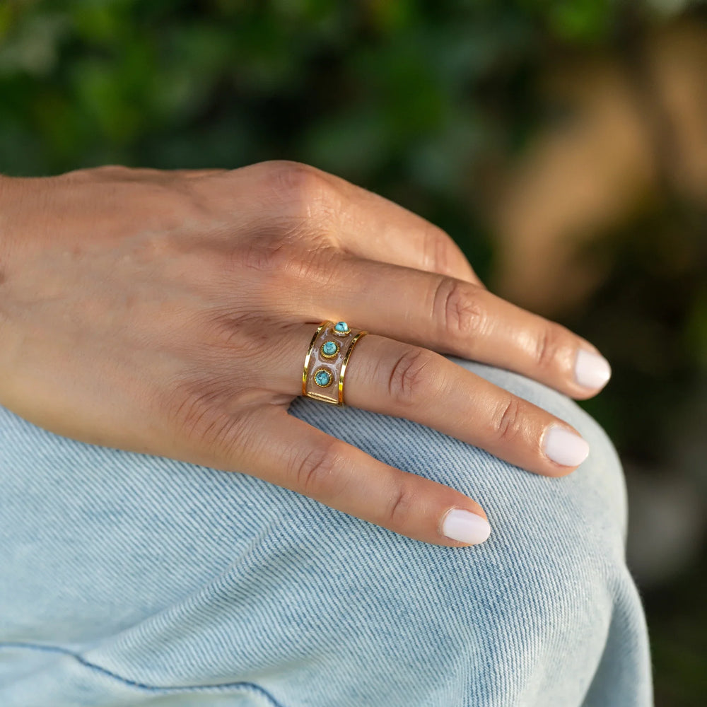 A bold band with delicate touches, the Turquoise Dot Ring features a wide gold base dotted with small round turquoise stones. Striking yet refined, it's the perfect everyday statement.